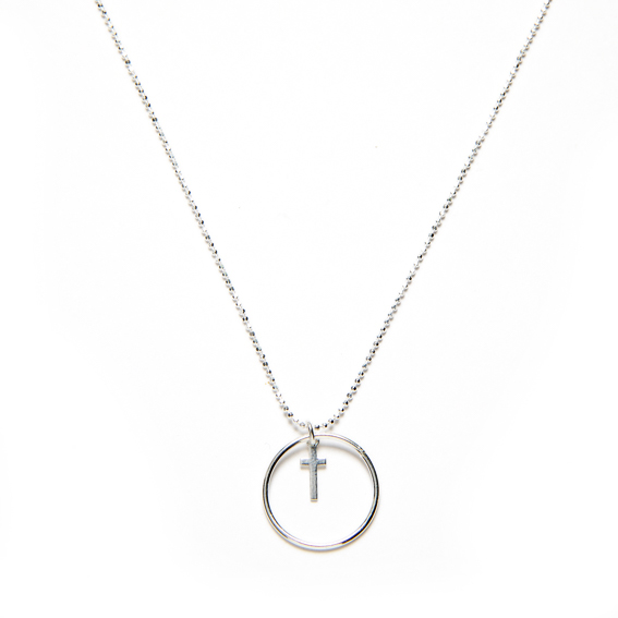 Collar en Plata de Ley. Diseño aro con cruz interior. Clásico y espiritual. Acabado en plata pulida.